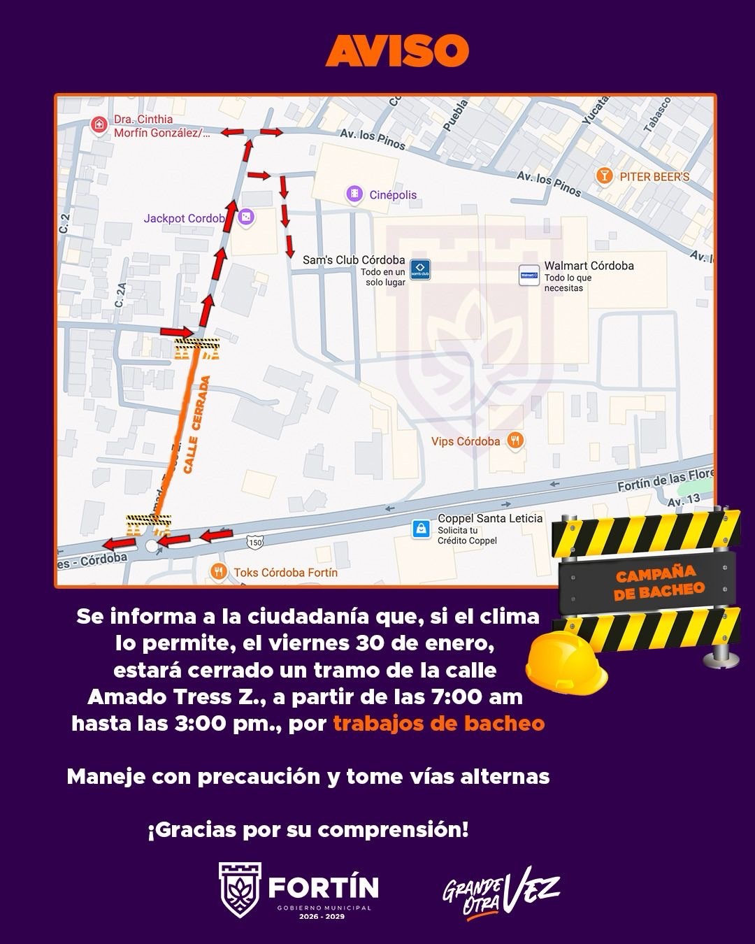Se informa que, sujeto a las condiciones del clima, este viernes 30 de enero, un tramo de la calle Amado Tress Z. permanecerá cerrado de 7:00 am a 3:00 pm por trabajos de bacheo.