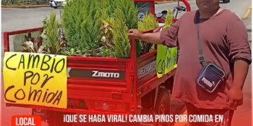 Su nombre es Ramón Torres Reyes y está ofreciendo pinos a cambio de comida. No pide dinero, solo busca apoyo para no regresar con las manos vacías.