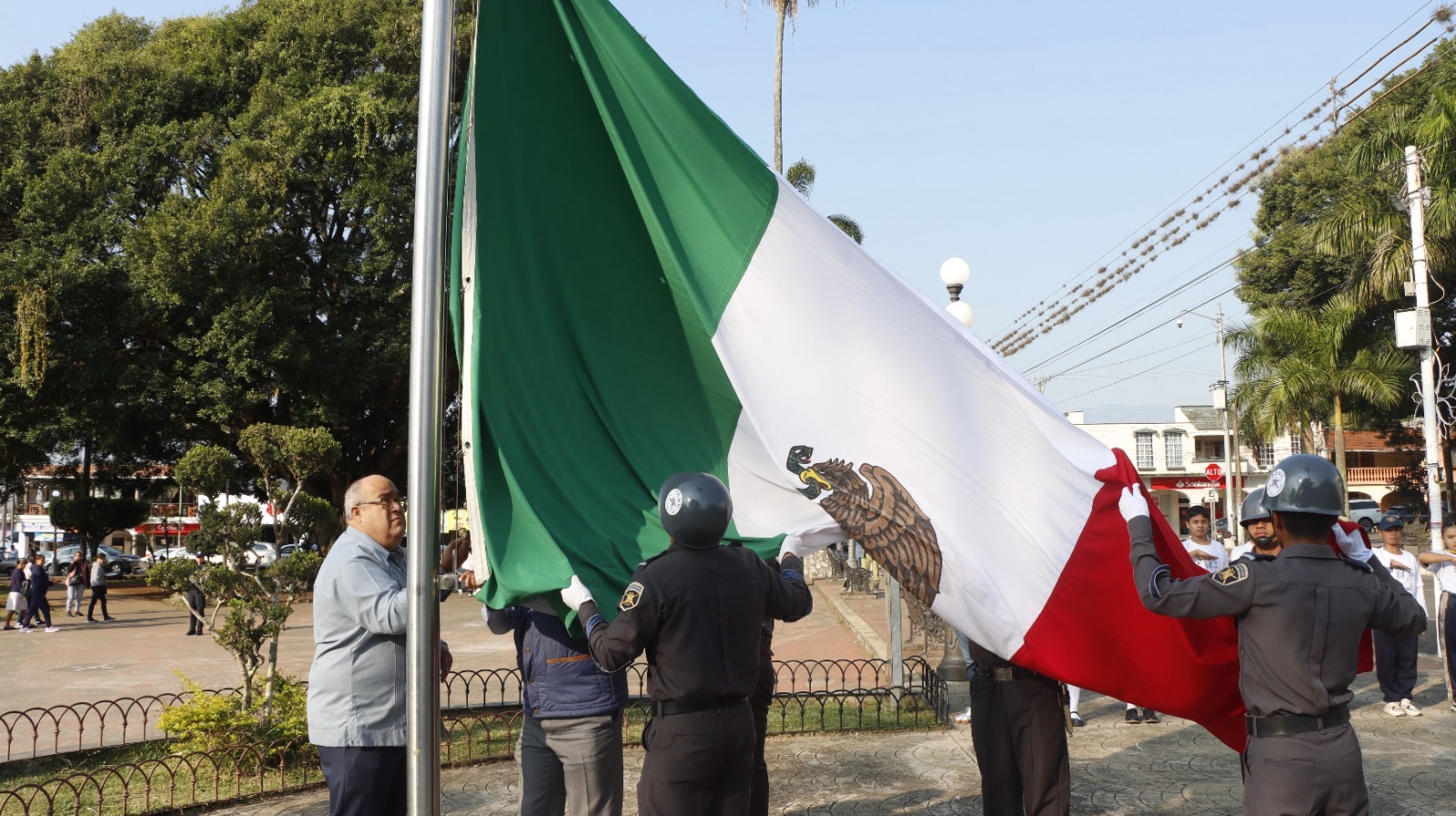 Acompañado de su cabildo, empleados de confianza y el apoyo de la escolta del Pentatlón para realizar los honores al lábaro patrio, en el parque Lázaro Cárdenas, el presidente municipal, destacó la presencia del nieto del benefactor, Mauricio Ruiz Galindo Espinoza y su hijo Fernando.